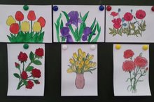 Урок музыки в 6 классе. Тема: " Инструментальный концерт А. Вивальди "Времена года". Вдохновлённые музыкой после прослушивания первой части, "Цветы" учащиеся нарисовали красивые цветы.