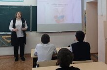 Торжественное поднятие флагов, исполнение гимнов. Первые декабрьские занятия Разговоров о важном посвящены теме "Волонтёры России". С 8-9 классами нашей школы классный руководитель поговорила о понятии волонтёрства, о рассказала о движении волонтёров в России, а также показала видеоролики от Российского движения детей и молодежи «Движение Первых».