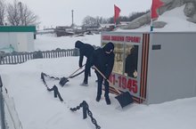 Юнармейцы очищают памятник "Погибшим воинам" от снега