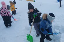 В нашем детском саду принимают участие в расчистке снега не только старшая группа, но и малыши активно и весело беруться за дело.