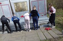 Учащиеся школы организовали уборку территории прилегающей к памятнику и обновили памятник, покрасили плиту памятника .