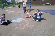 К Дню России пришкольном лагер провели акцию "Россия рисует".Дети рисовали Флаг России на афальте цветными мелками.