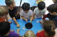 В процессе опытно-экспериментальной деятельности ребята получили представление о том, что воду можно собирать различными предметами: губкой, пипеткой, резиновой грушей. Капелька путешествовала из одной ёмкости в другую. Опускали в воду губку, затем отжимали её в тарелочки. Набирали воду резиновой грушей и пипеткой, переливали в стаканчик. Ребята узнали, что собирать воду пипеткой очень долго, а резиновой грушей и губкой быстрее.
