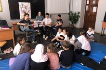 После минутки здоровья и вкусного завтрака приступили к занятиям: сегодня в гости пришли активисты гитарного кружка "Станция звуков" всё вместе пели песни под гитару.