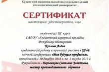 С 10.12.2018 г. по 01.03.2019 на базе Федерального государственного бюджетного образовательного учреждения высшего образования «Казанский национальный исследовательский технологический университет» прошла III-я заочная конференция школьников и студентов СПО «Моя будущая профессия». В конференции представила работу и приняла участие обучающаяся 3 курса Козлова Алёна (руководитель мастер производственного обучения Барышкова Светлана Загитовна). По итогам конференции сформирован и размещен на сайте ФГБОУ ВО "КНИТУ" электронный вариант сборника статей и тезисов школьников, студентов.
