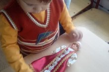 В группе первого раннего возраста «Лучики», с целью формирования развития мелкой моторики и сенсорного развития, дети учатся «застегивать пуговичку»: надевают разноцветные цветочки на пуговицы....