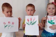 В преддверии празднования «Дня Победы», дети второй группы раннего возраста «Сказка» рисовали одноразовыми вилками, отпечатками из овощей «Праздничный салют».