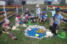 1 августа, с целью знакомства с растительным и животным миром, группа «Капитошки» направилась на прогулку по территории образовательных терренкуров «Мини-поле», «Бабушкино подворье», «Террариум», «Царство грибов», «Подводный мир», «Мир птиц».