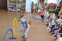 3 мая в режиме дня, с целью формирования сенсорного опыта, с малышами первой группы раннего возраста «Радуга» была проведена игра «Прокати шарик в ворота».