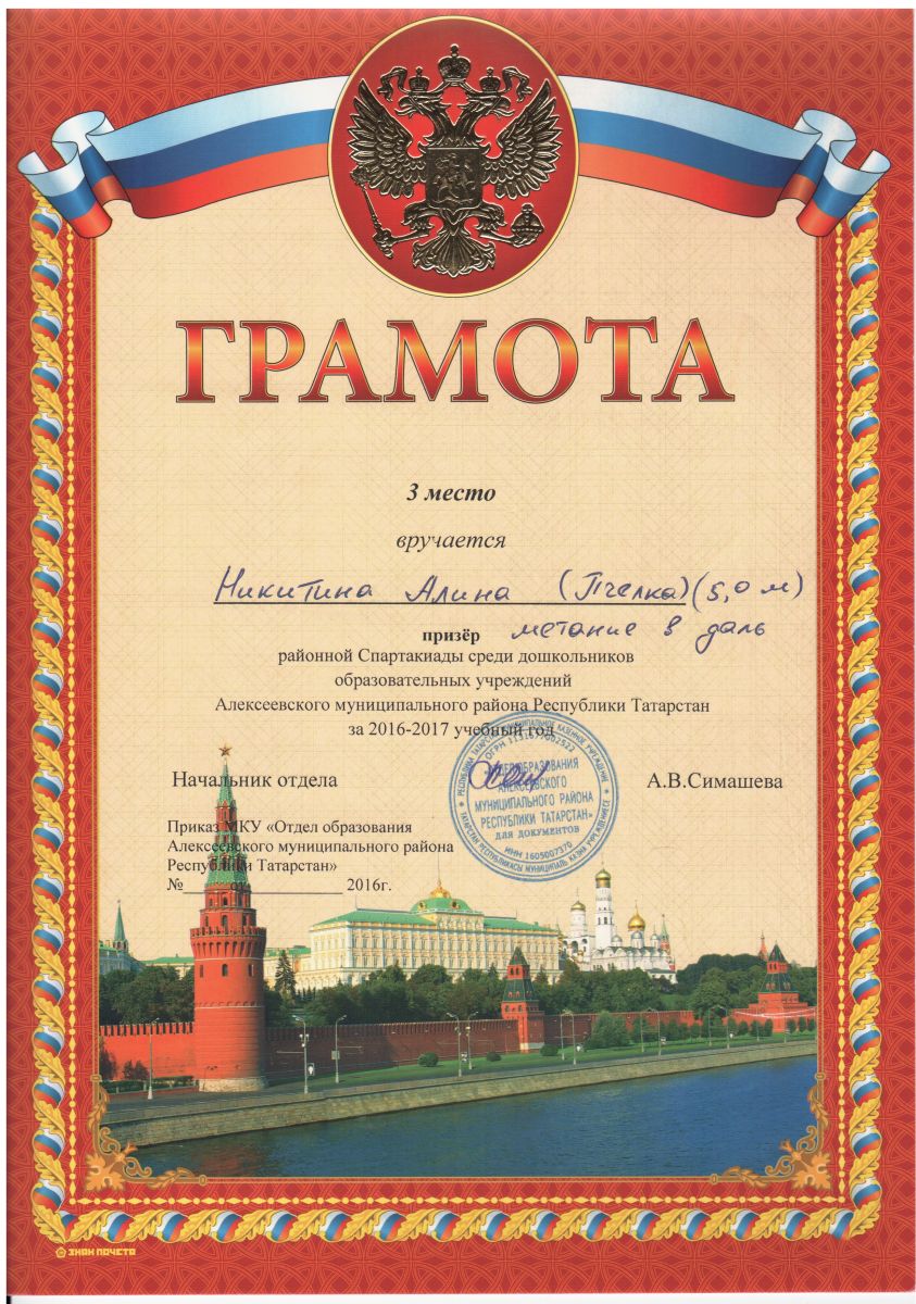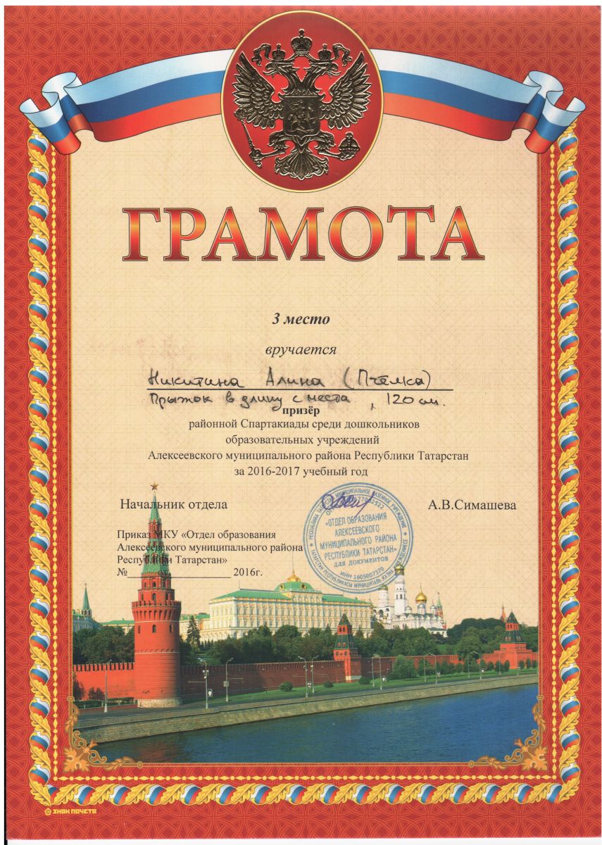 Грамота II степени призера районной Спартакиады среди дошкольников образовательных учреждений Алексеевского муниципального района РТ за 2016-2017 учебный год