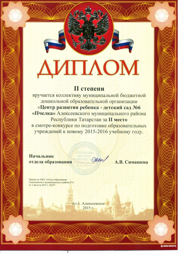Диплом II степени в подготовке детского сада к новому 2016-2017учебному году