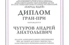 В декабре 2018 года прошел республиканский конкурс антинаркотических профилактических видеороликов среди образовательных организаций дополнительного образования детей и объединения дополнительного образования детей на базе общеобразовательных организаций "Парад идей". МБУДО "Центр детского творчества" (педагог дополнительного образования - Чугуров Андрей Анатольевич) стал обладателем Гран-При в номинации "Военно-патриотическое воспитание и образование детей".