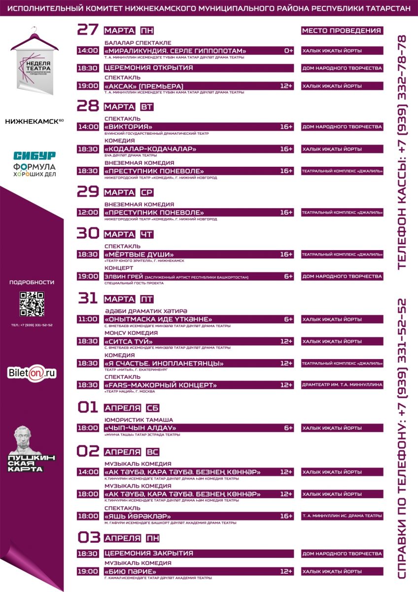 С целью популяризации театрального искусства, приобщения населения к лучшим традициям различных театральных направлений, с 27 марта по 3 апреля 2023 года на трёх площадках города Нижнекамск: Дом народного творчества, театральный комплекс «Джалиль» и Государственный Татарский Драматический театр им. Т.А. Миннуллина пройдёт «Неделя театров нефтегазохимических городов России».Проект реализуется при поддержке ООО «Сибур» в рамках программы социальных инвестиций «Формула хороших дел».Приглашаются жители района посетить постановки в рамках проекта. -