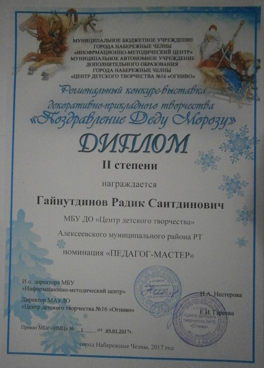 Региональный конкурс-выставка декоративно-прикладного творчества "Поздравление Деду Морозу", номинация "Педагог-мастер", Гайнутдинов Р.С., Диплом II степени, январь 2017 г.