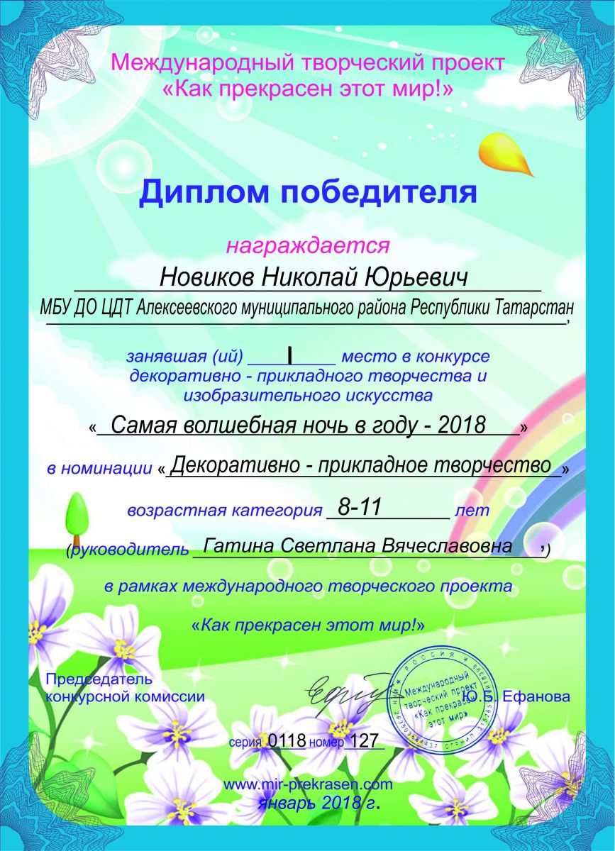 ► Международный творческий проект "Как прекрасен этот мир!"- конкурс  "Самая волшебная ночь в году-2018", Новиков Николай, 1 место, январь 2018