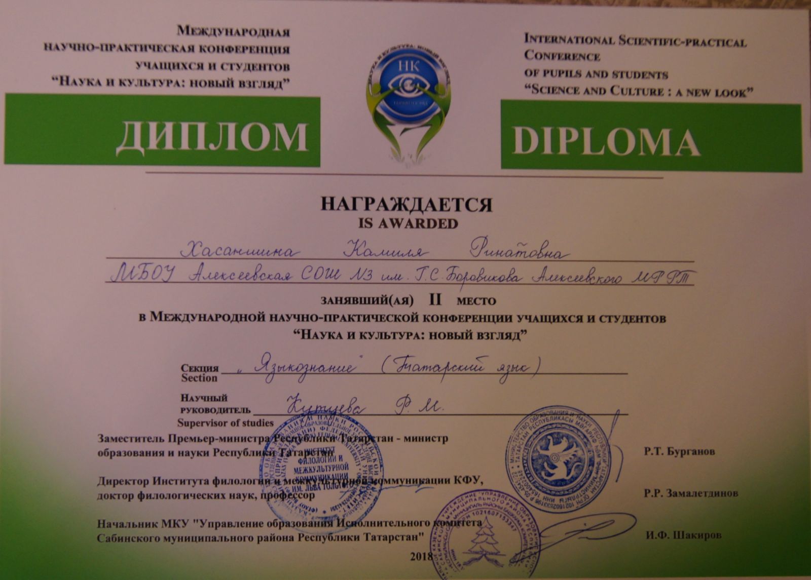 ► Международная научно-практическая конференция чащихся  студентов "Наука и кльтура: новый взгляд", Хасаншина Камия, 2 место