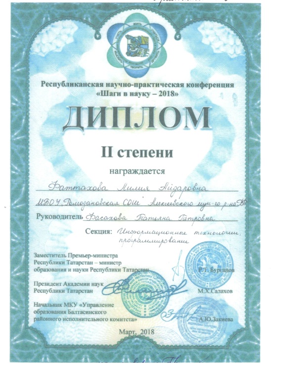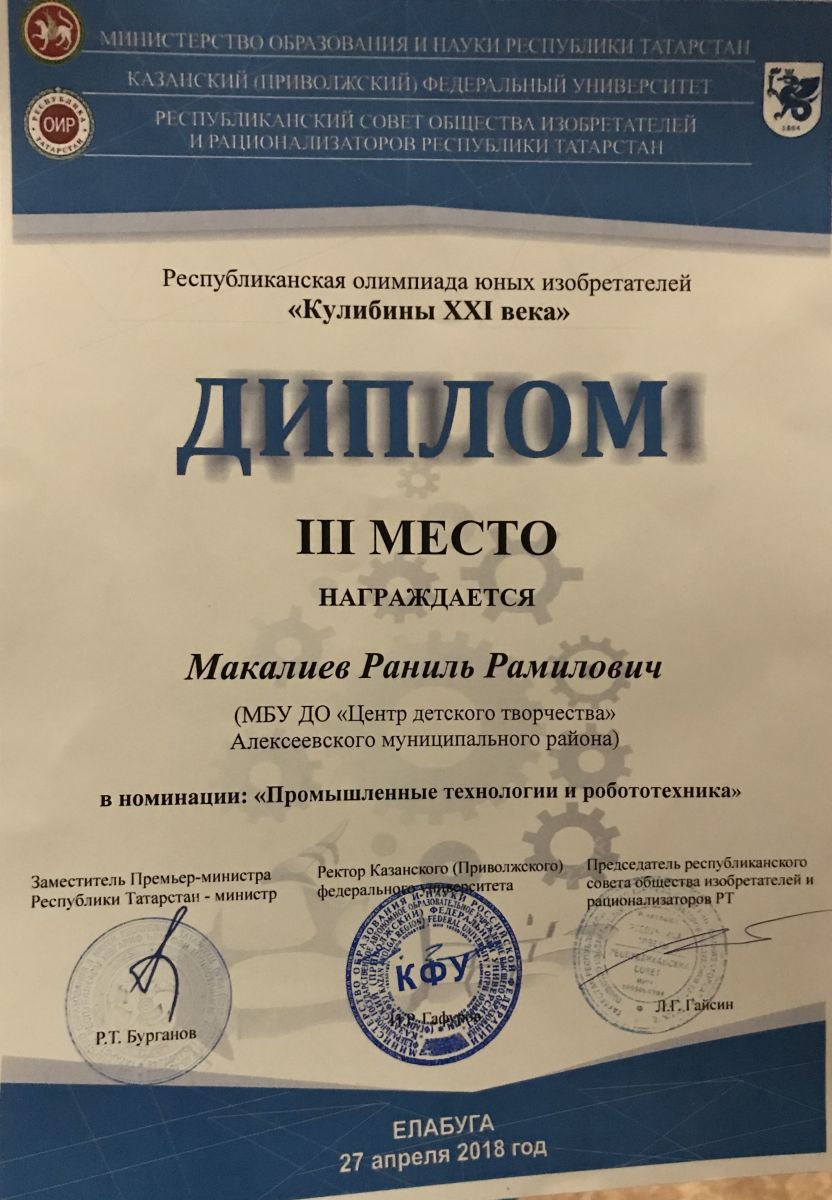 ► Республиканский турнир "Компьютерная грамотсноть", Махмутов Адель, Диплом 3 степени, апрель 2018