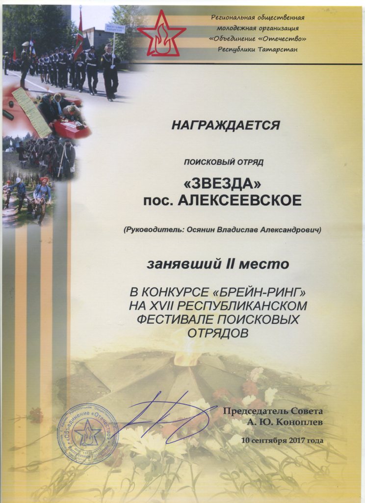 ► XVII республиканский фестиваль поисковых отрядов, клуб "Звезда", 2 место - сентябрь 2017