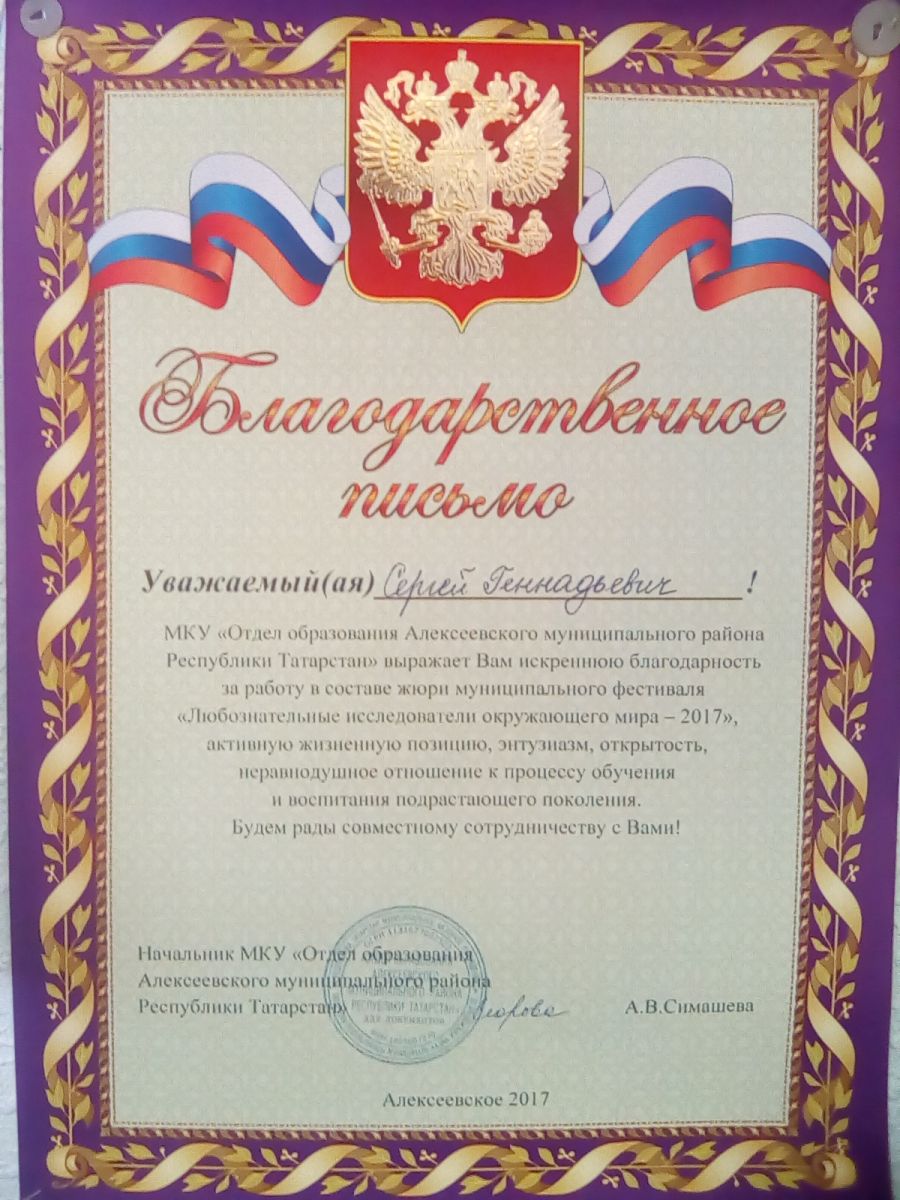 Муниципальный фестиваль "Любознательные исследователи окружающего мира-2017", Зимняков С.Г.