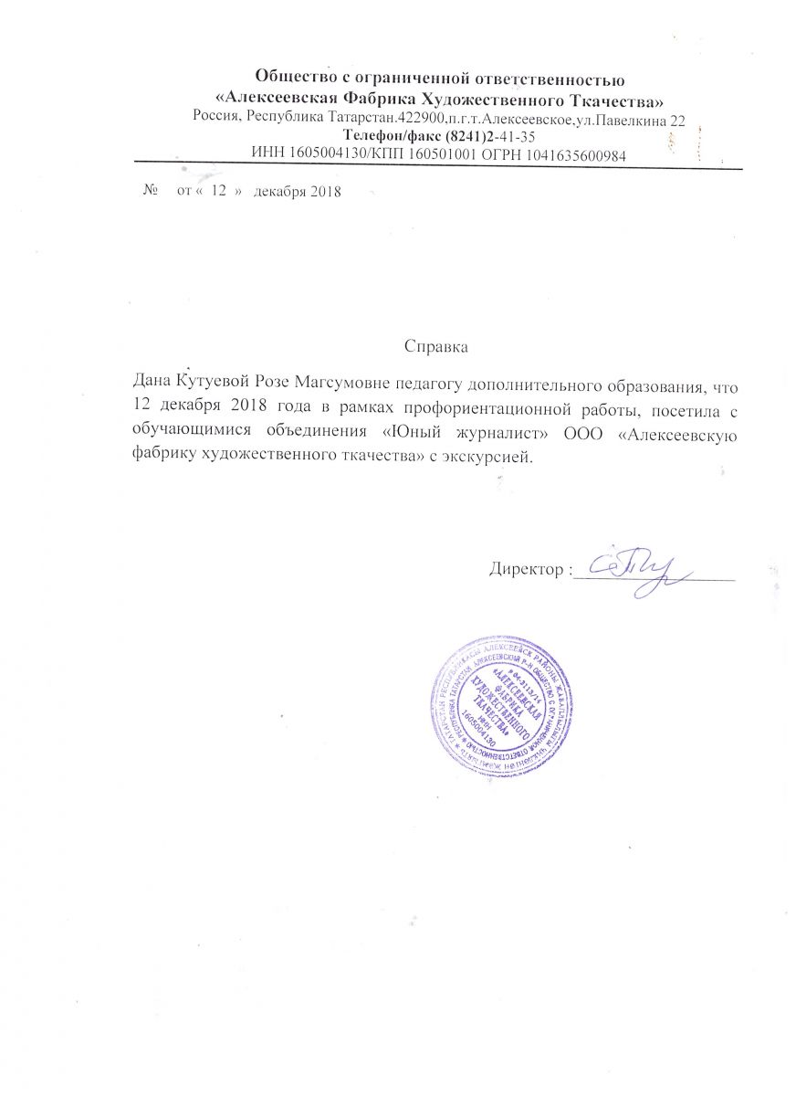 ► Справка о посещении ООО "Алексеевская ФХТ"