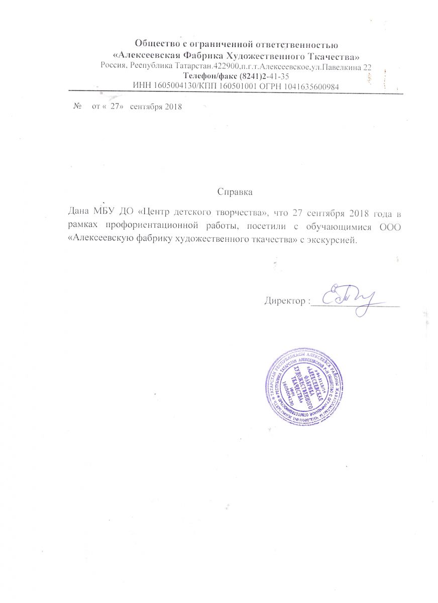 ► Справка с ООО "Алексеевской фабрики художественного ткачества" (сентябрь)