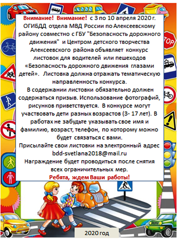 Опубликовано: 04.04.2020Внимание! Внимание! с 3 по 10 апреля2020 г. ОГИБДД отдела МВД России по Алексеевскому району совместно с ГБУ "Безопасность дорожного движения" и Центром детского творчества объявляет конкурс листовок для водителей или пешеходов. Листовка должна отражать тематическую направленность конкурса. В содержании листовки обязательно должен содержаться призыв. Использование фотографий, рисунков приветствуется. В конкурсе могут участвовать дети разных возрастов (3- 17 лет). В работах не забудьте указывать свое имя и фамилию, возраст, телефон, по которому можно будет связаться с вами.