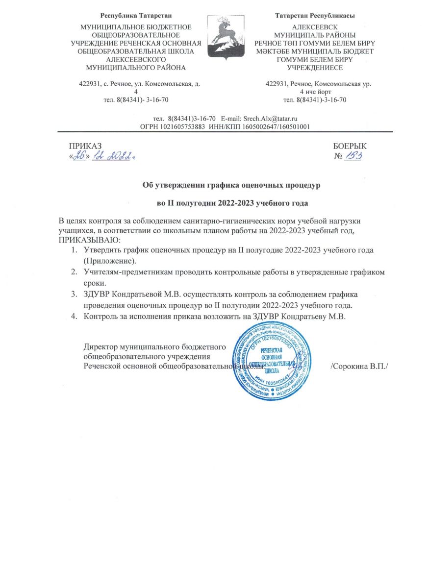 Приказ об утверждении графика проведения оценочных процедур на 2 полугодие 2022-2023 уч.года