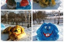 Территория нашей школы погрузилась в новогоднюю сказку. В один миг на радость детворе выросли снежные фигуры: огненная собака- символ нового 2018 года, герои любого нового года Дед Мороз и Снегурочка, и другие сказочные зверюшки.