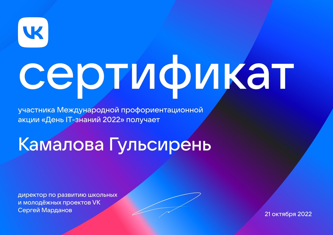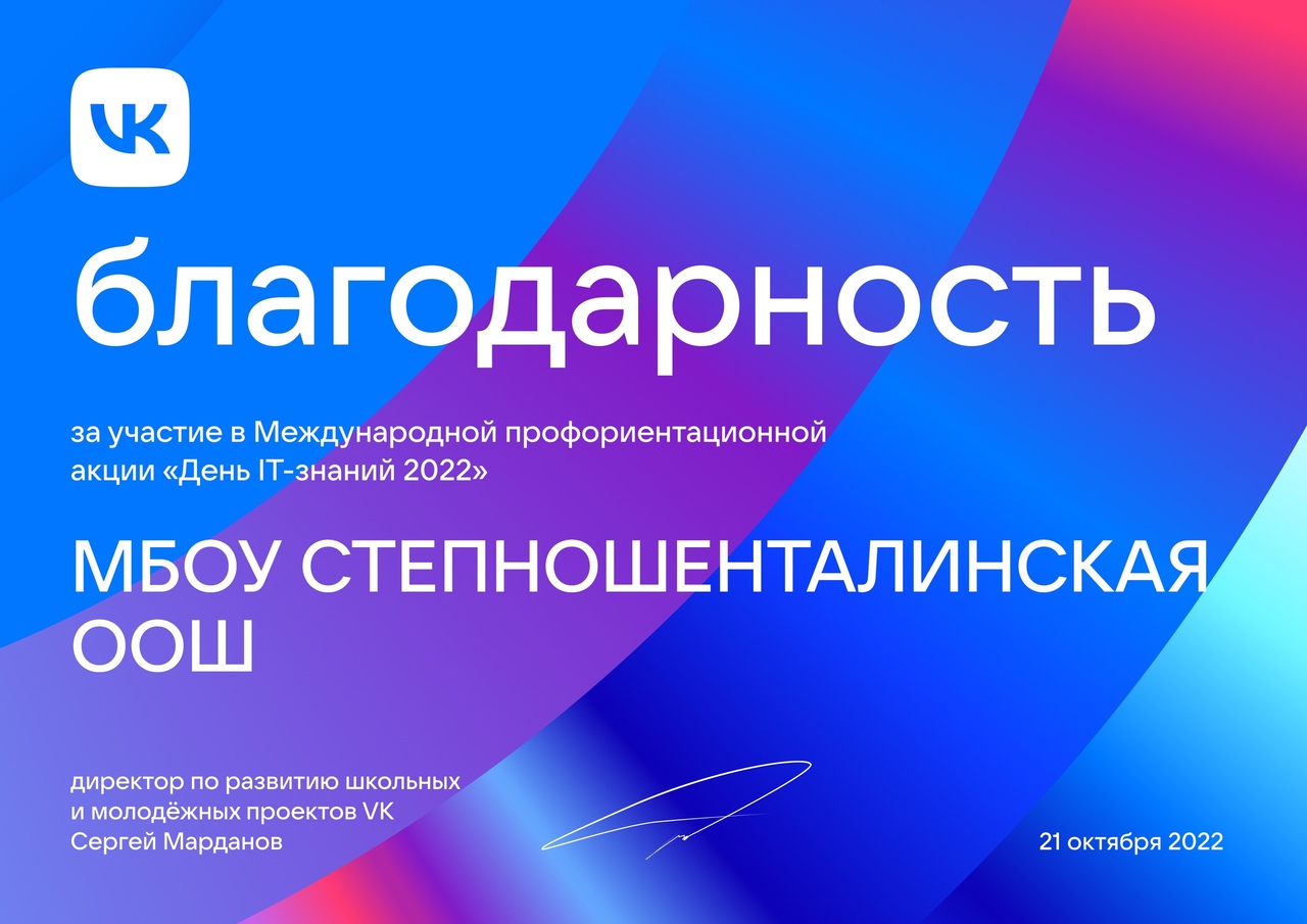 Департамент цифровой трансформации и больших данных Министерства просвещения Российской Федерации совместно с компанией VK 21 октября 2022 г. провели профильное мероприятие «День ИТ-знаний – 2022» в формате интерактивного урока-презентации, урока-дискуссии между специалистами ИТ-отрасли и обучающимися. Цель проекта: планирование профессионального будущего школьников, в том числе связанного с ИТ-сферой, стимулирование интереса к информационным технологиям и мотивирование к выбору карьерной траектории в этой сфере, а также развитие кадрового потенциала в области цифровой экономики. Тема этого года — видеотехнологии. Учащиеся нашей школы приняли участие в профориентационной акции от ВК «День «IT- знаний» .