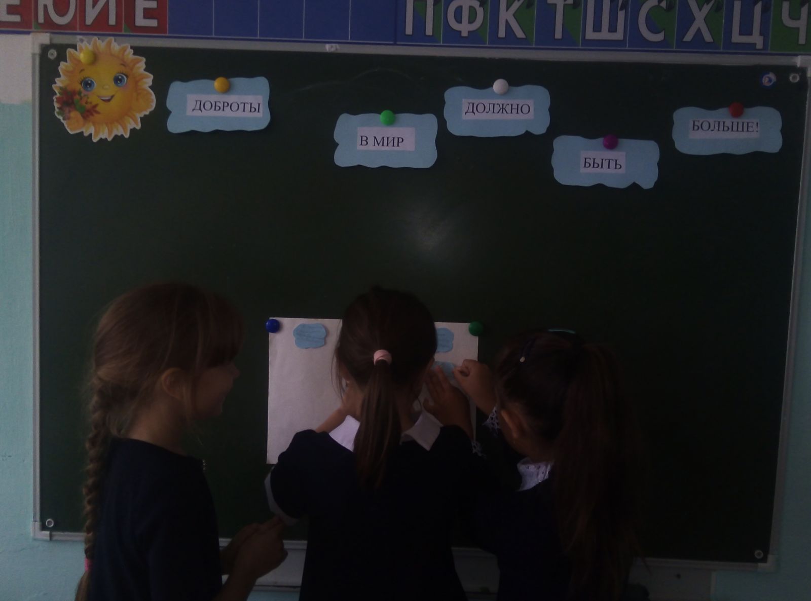 Ребята рассказали о своих добрых делах. В конце написали свои пожелания друзьям, родителям,одноклассникам на "облаках" и приклеили их для исполнения./ Психология атналыгы кыссаларында башлангыч сыйныф укучылары катнашында "Җир йөзендә яхшылык күбрәк булырга тиеш", дип исемләнгән чара узды. Укучылар башкарган яхшы гамәлләре турында фикер алышты.Соңыннан алар үзләренең изге теләкләрен "болытларга" язып куйдылар.