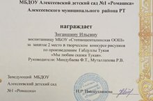 Воспитанницы Идрисова Ильвина и Зиганшина Ильсина заняли призовые места в творческом конкурсе рисунков по произведениям Тукая.Молодцы!