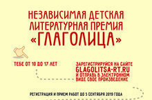 11 марта 2019 года стартовала VI Независимая Детская Литературная Премия «Глаголица», wvvw.glagolitsa-rt.ru. прием конкурсных работ осуществляется до 05 сентября 2019 г. включительно. Данному конкурсу присвоен статус международного конкурса, в связи с широкой географией Литературной Премии.