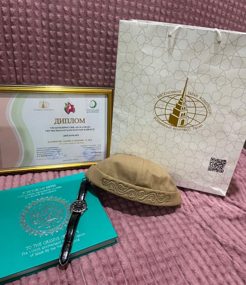 С 26 по 28 марта в Казани прошел финал конкурса "Ак калфак" укучы кызлар һәм егетләр бәйгесе" (Конкурс на премию "Ак калфак" среди юношей и девушек"). На конкурсе участвовал ученик 9 класса Зарипов Даниль. Конкурс состоял из 3 туров и финала. На первый тур учащиеся должны были написать сочинение, второй тур — живая онлайн-беседа. Третий тур — нужно было записать два видео с творческим номером и хобби. Выполнив все эти задания, Даниль прошел в финал.