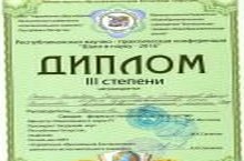 Дипломом III степени награждаются ученики 9 класса в республиканской научно-практической конференции "Шаги в науку - 2016" в секции физика и техническое творчество".