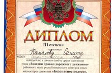 Победитель в личном зачёте среди мальчиков ученик 3 класса Камалов С. этапа "Знатоки правил дорожного движения" награждён Дипломом III степени в районном этапе республиканского конкурса юных инспекторов движения "Безопасное колесо", посвящённое 70-летию Великой Победы. Руководитель: Заббарова Г.Р.