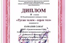 Ученик 3 класса Камалов Самат награждён Дипломом II степени в III Республиканском конкурсе чтецов "Туган телем - серле тел" в номинации "Гасырлардан гасырларга". Руководитель: учитель начальных классов Камалова С.Р. 25.03.2015