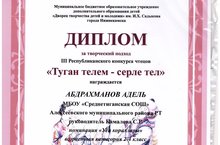Ученик 2 класса Абдрахманов Адель награждён Дипломом в III Республиканском конкурсе чтецов "Туган телем - серле тел" в номинации "Уен кораллары". Руководитель: учитель начальных классов Камалова С.Р. 25.03.2015