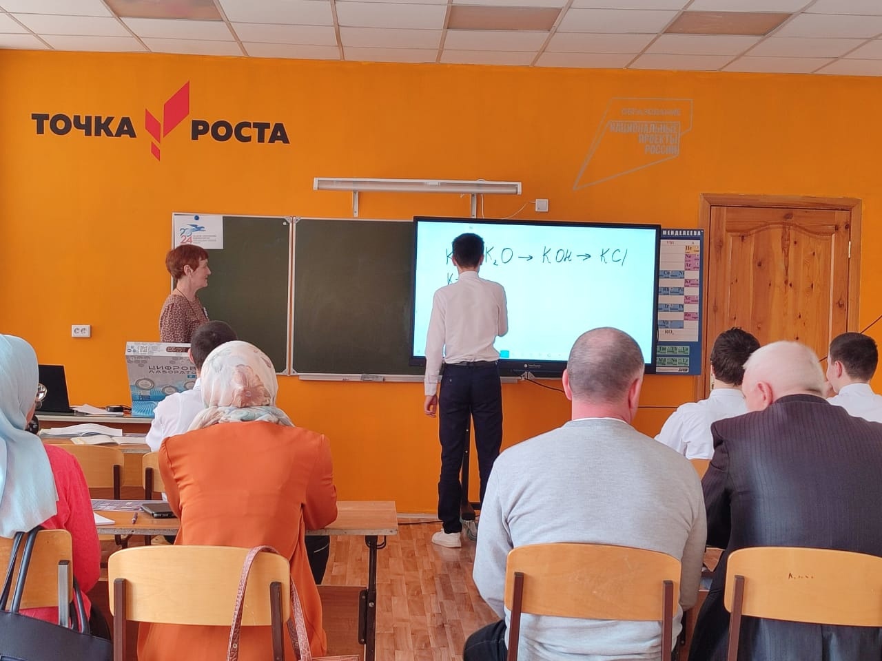 Учитель химии первой квалификационной категории Халилова Ф.Г. провела открытый урок для 8 класса по теме: «Характеристика химического элемента по его положению в Периодической системе Д.И. Менделеева». Далее она провела мастер-класс по использованию цифровой лаборатории оборудования образовательного центра «Точка роста» для определения уровня pH.»