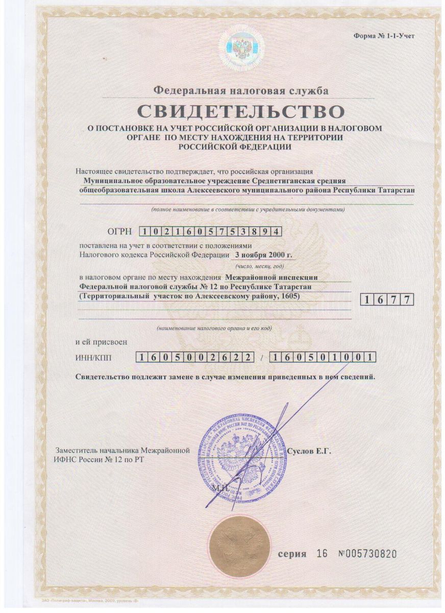 Свидетельство о постановке на учёт Российской организации в налоговом органе по месту нахождения на территории РФ