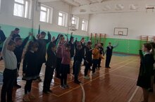 В МБОУ Сахаровская ООШво время перемены участниками Движения первых была организована зарядка . -