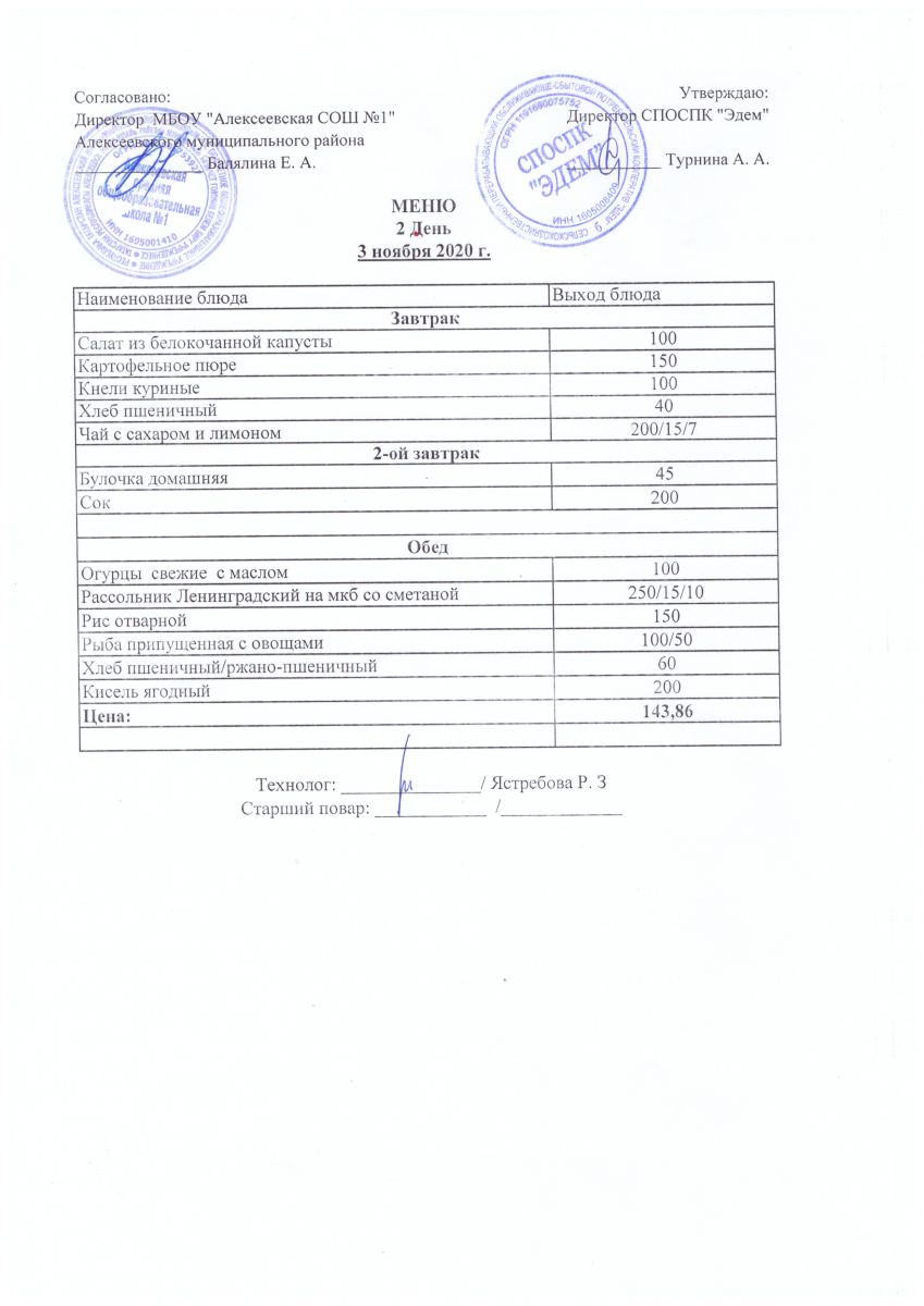 ►Меню пришкольно-оздоровительного лагеря. Ноябрь 2020.