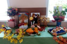 5 октября, в рамках районного празднования Дня учителя, образовательные организации подготовили творческие выставки на осеннюю тематику. Коллектив педагогов и обучающихся нашей школы подготовили выставку по теме «Осенний калейдоскоп». Представляющие выставку ребята отметили, что осень для школы – особая пора, во-первых, это начало учебного года, во вторых, осенью проходит замечательный праздник - День учителя! Школьная жизнь, как и осенняя природа богата разнообразными яркими красками, красочными событиями.