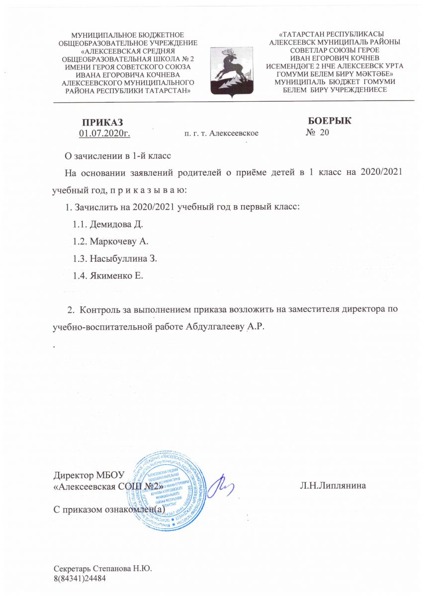 Приказ №20 от 01.07.2020 года "О зачислении в 1-й класс"