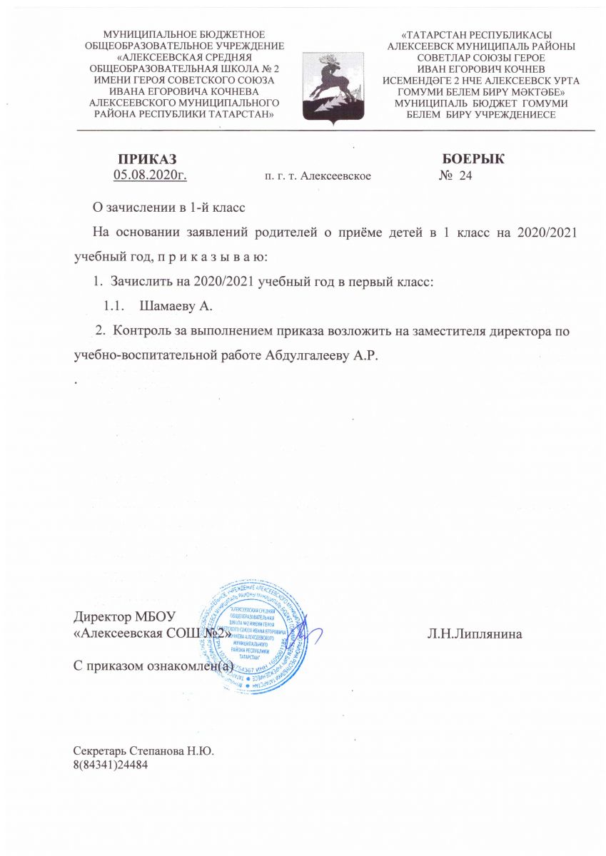 Приказ №24 от 05.08.2020 года "О зачислении в 1-й класс"
