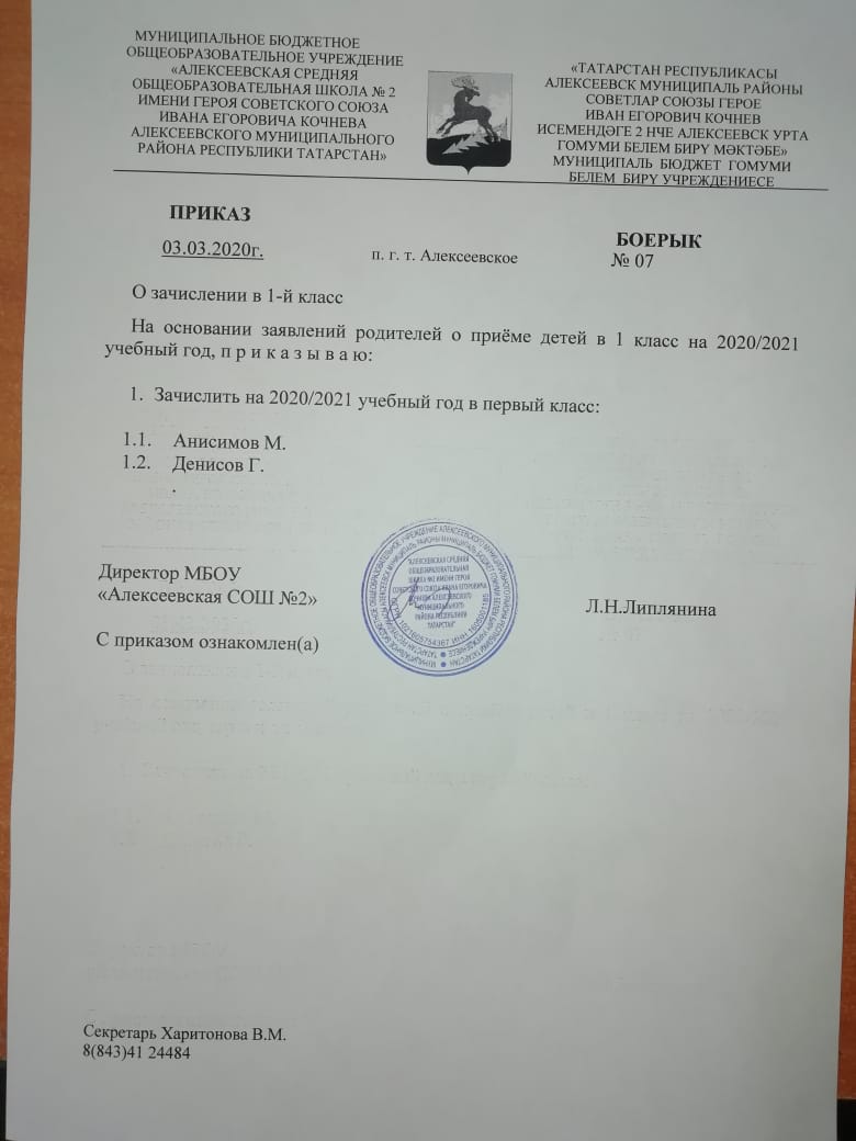 Приказ №07 от 03.03.2020 года "О зачислении в 1-й класс"