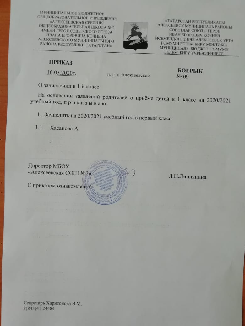 Приказ №09 от 10.03.2020 года "О зачислении в 1-й класс"