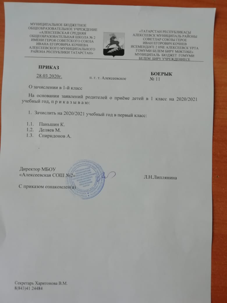 Приказ №11 от 28.03.2020 года "О зачислении в 1-й класс"