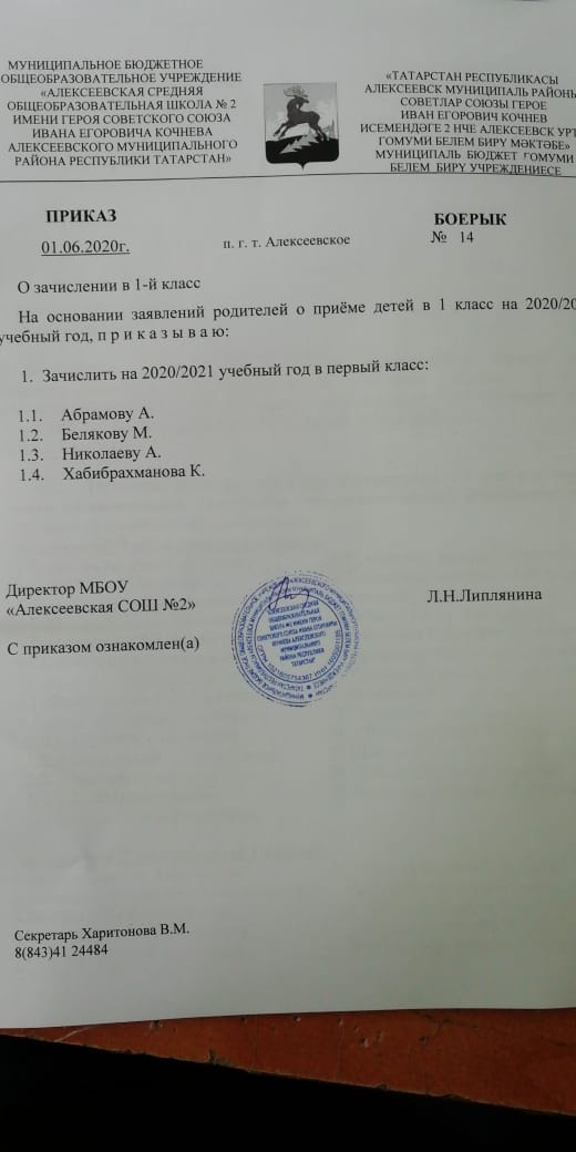 Приказ №14 от 01.06.2020 года "О зачислении в 1-й класс"