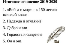 Министр просвещения Российской Федерации О.Ю. Васильева озвучила пять открытых направлений для тем итогового сочинения в выпускных классах нового учебного года.Среди них «Война и мир» – к 150-летию великой книги, «Надежда и отчаяние», «Добро и зло», «Гордость и смирение», «Он и она». Темы утверждены Советом по вопросам проведения итогового сочинения в выпускных классах под председательством Натальи Дмитриевны Солженицыной.Ежегодно в декабре учащиеся 11-х классов пишут итоговое сочинение. Работы оцениваются в формате «зачёт» или «незачёт», и при успешном написании школьники получают доступ к государственной итоговой аттестации. Дети с ограниченными возможностями здоровья имеют право выбрать вместо сочинения написание изложения. Для тех, кто не справился с заданием, предусмотрена возможность пересдачи.