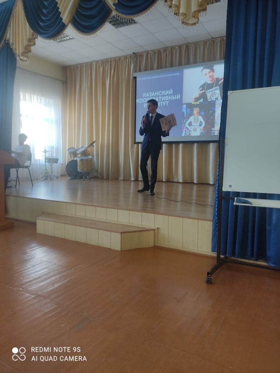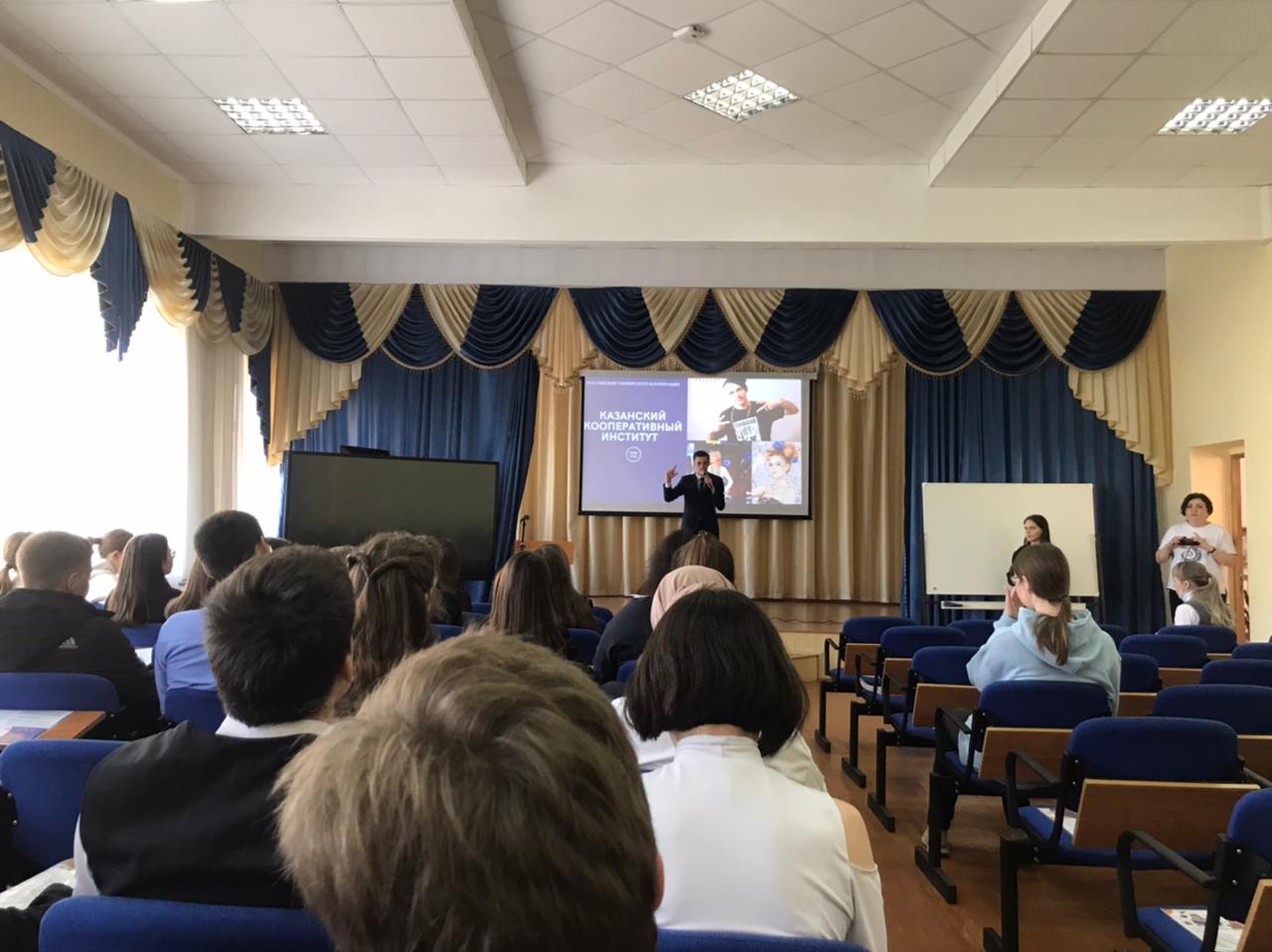 Бүген югары сыйныф укучылары Казан кооператив институты студентлары һәм укытучылары белән очраштылар, алар әлеге уку йортында укуның үзенчәлекләре турында сөйләделәр һәм булачак студентларның һөнәри ориентациясенә уен үткәрделәр.
